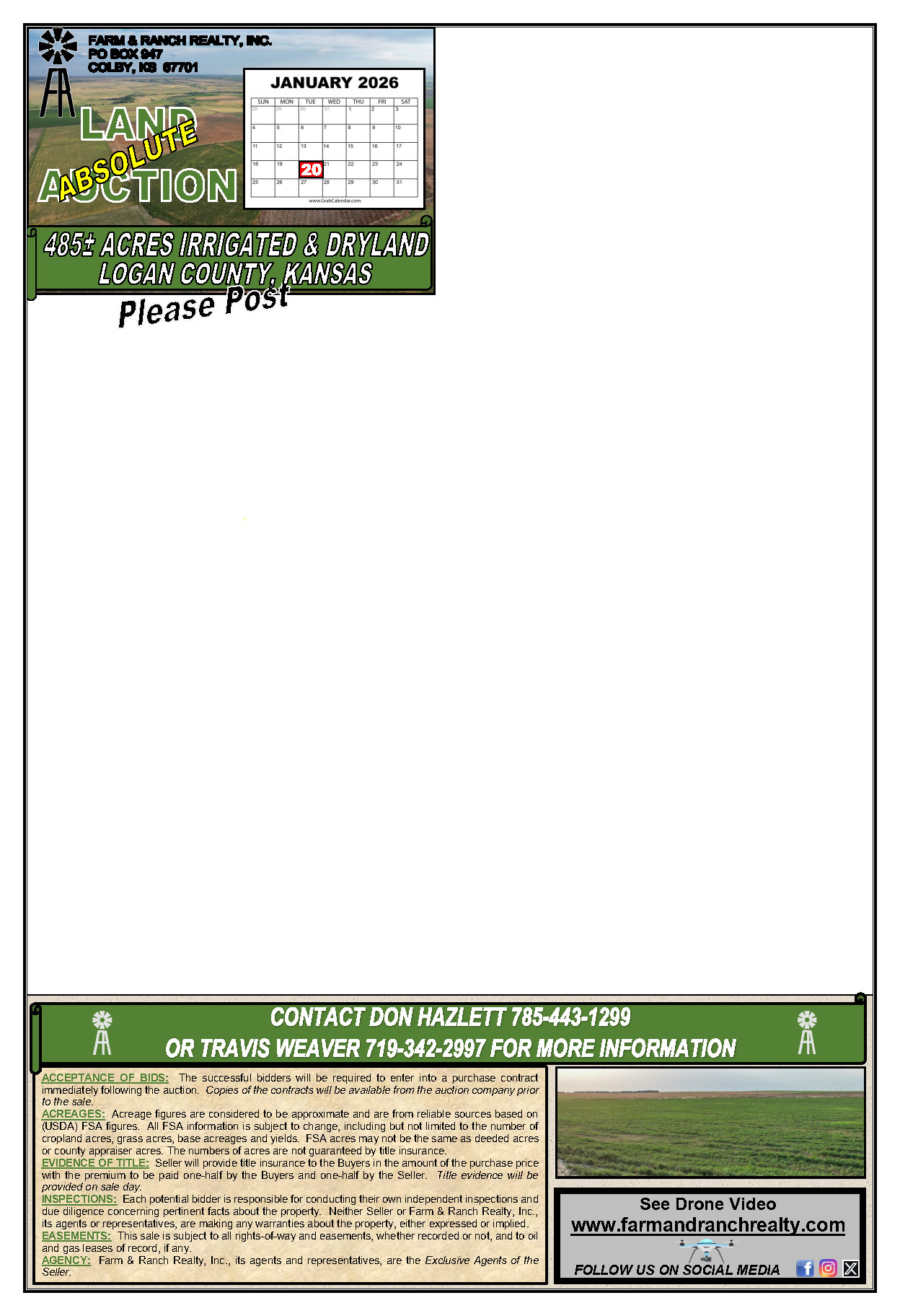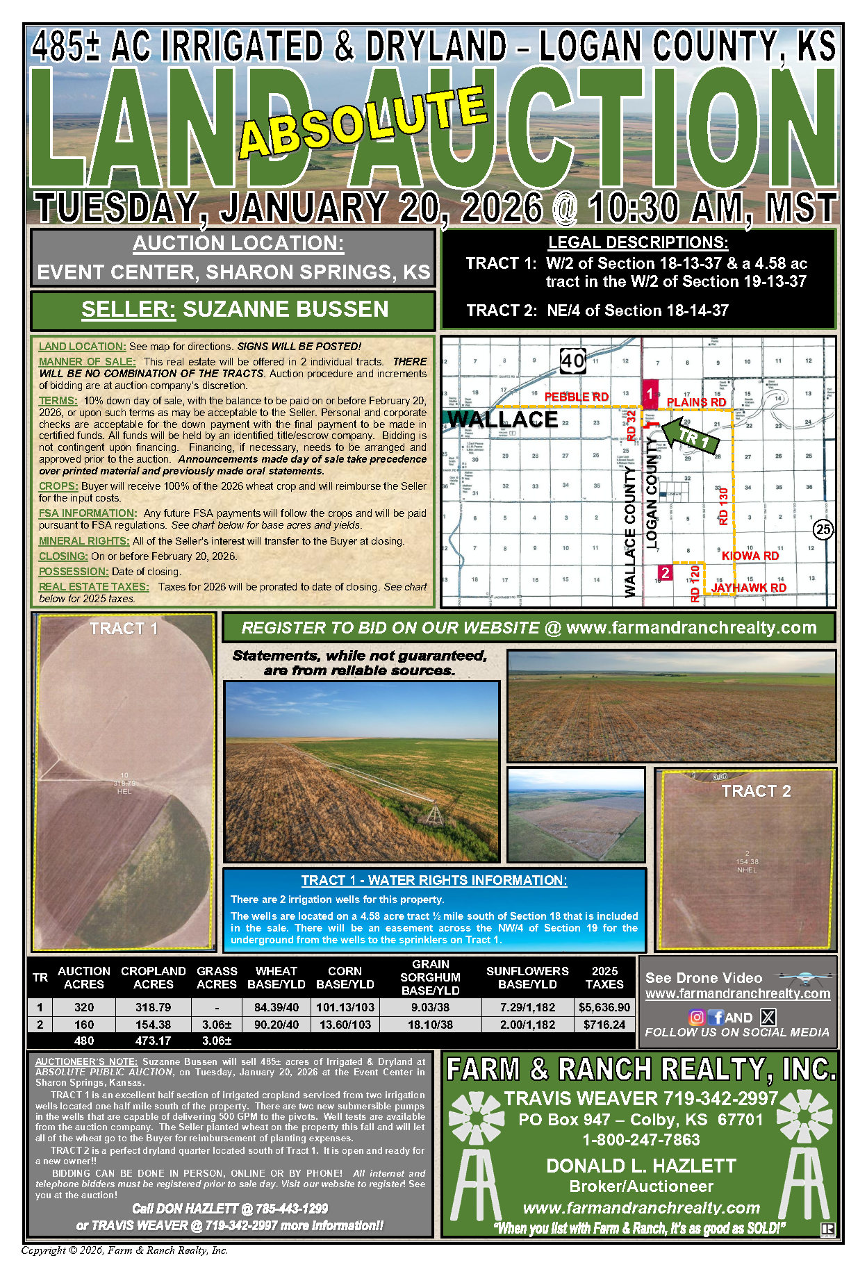 AUCTIONEER’SNOTE: Suzanne Bussen will sell 485± acres of Irrigated & Dryland atABSOLUTE PUBLIC AUCTION, on Tuesday, January 20, 2026 at the EventCenter in Sharon Springs, Kansas.